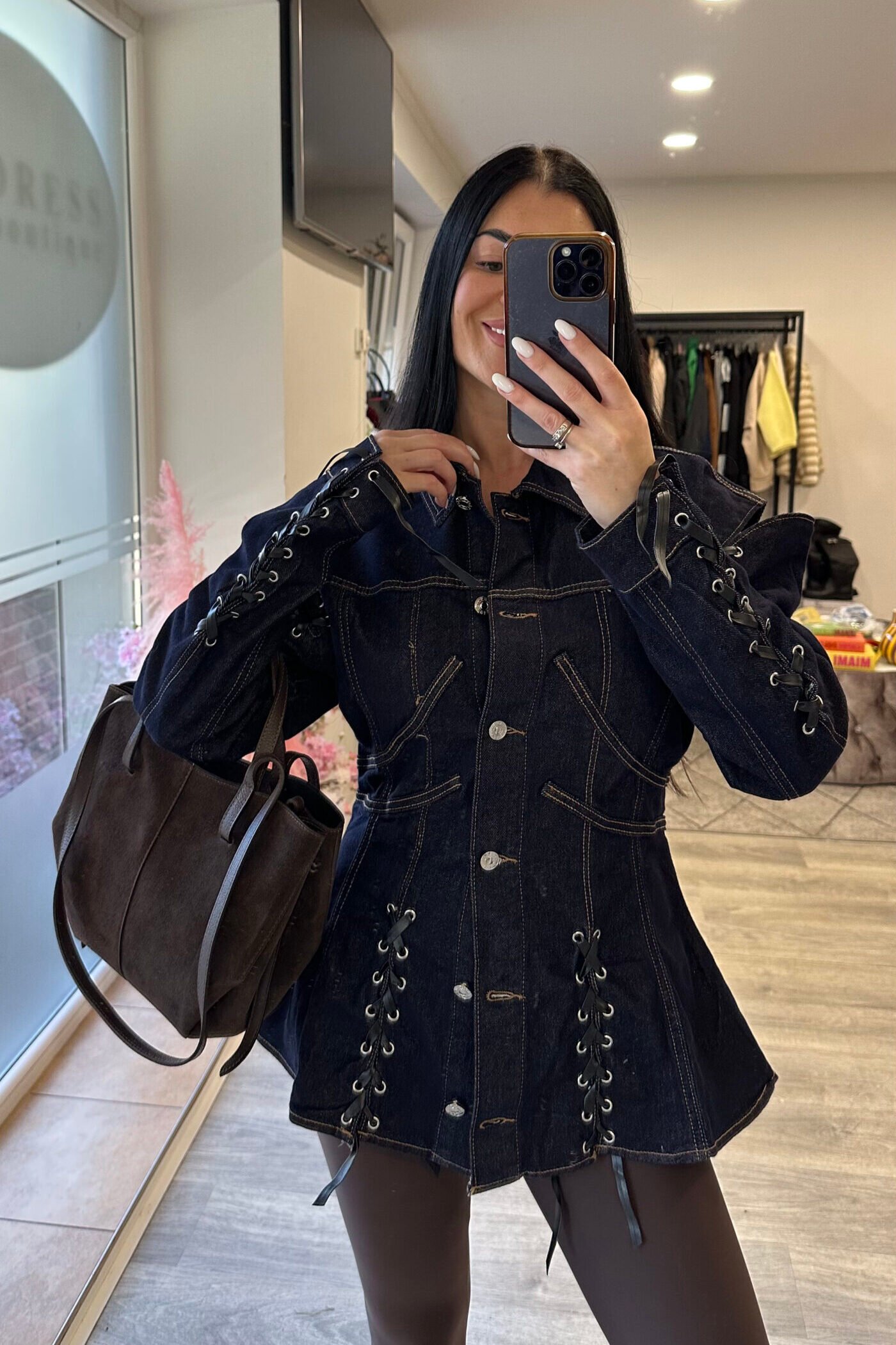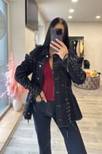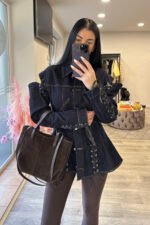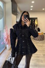 stilingas tamsaus džinso ilimenuotas švarkelis su raišteliais. modelio ugis 170 cm.