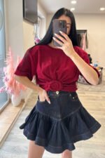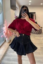Topinis mini tamsaus džinsi sijonukas plisuotas. modelio ugis 170 cm.